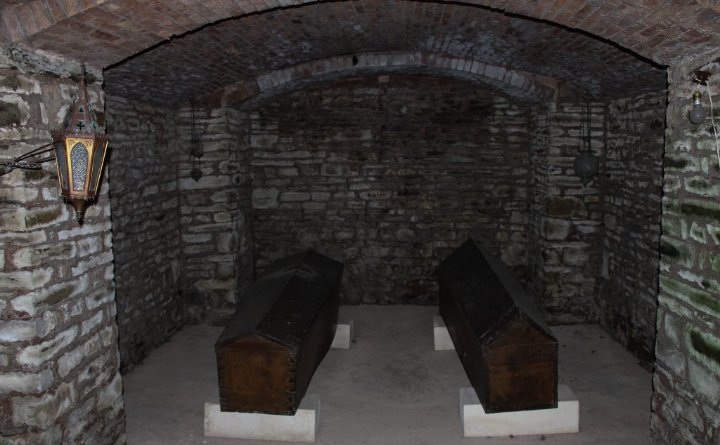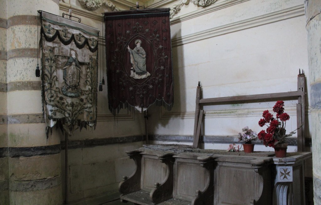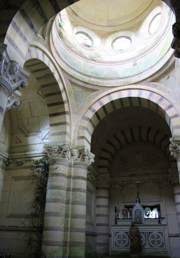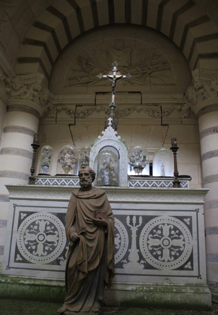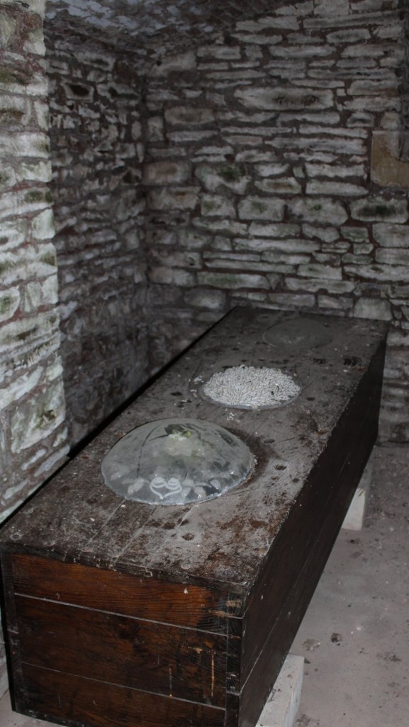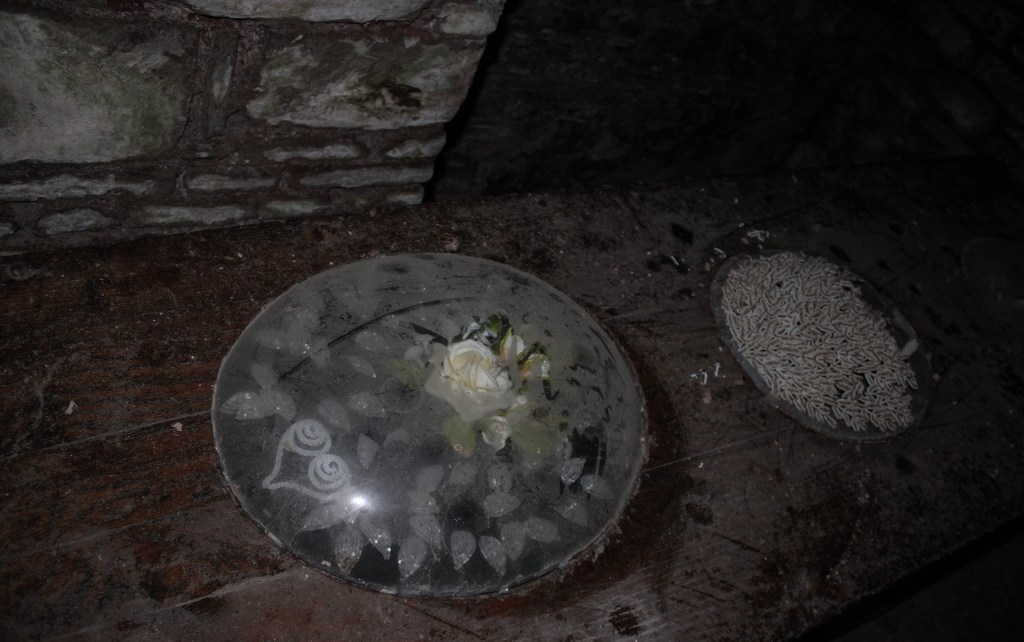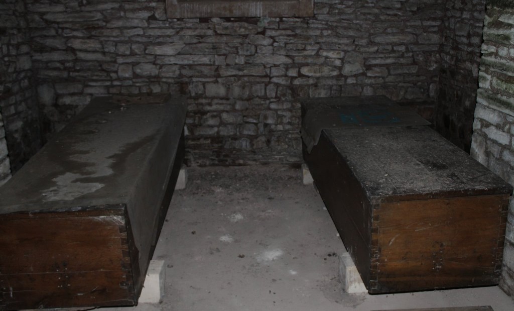 A l’intérieur la surprise est de taille et la chapelle n’est clairement plus entretenue depuis bien longtemps. Mais c’est par un large escalier qui permet de descendre dans une obscurité presque totale que j’ai pu découvrir une petite crypte avec 5 cercueils parfaitement bien disposés et conservés dont il s’agirait de personnes riches et connus du secteur enterrées dans ce caveau. Une incroyable et surprenante découverte et qui fut chargés d’émotions pou ma part