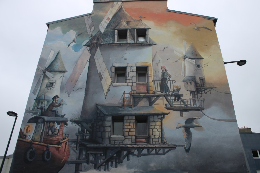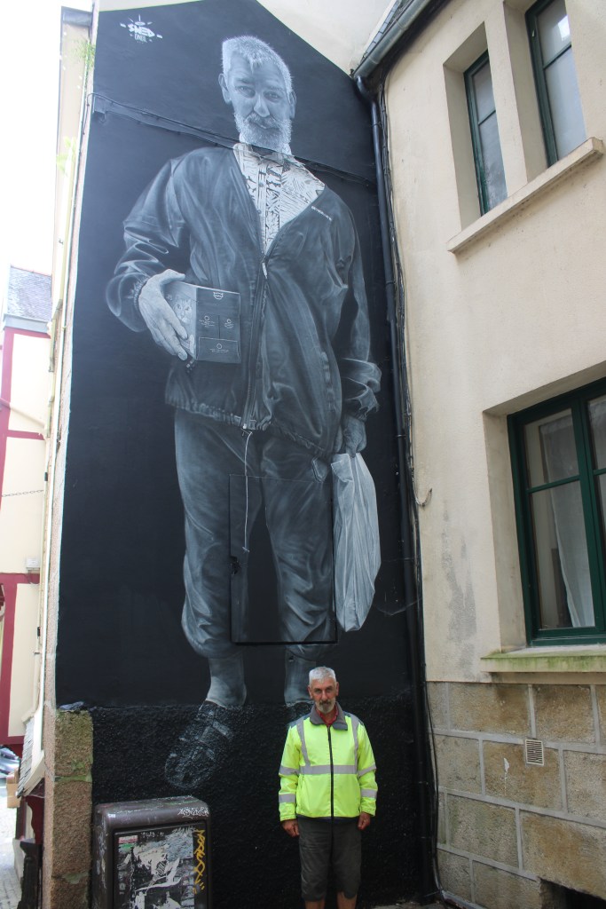 Me voila déjà en début d’après-midi, rien ne me presse, j’ai encore un peu de temps devant moi et je décide de terminer mon road-trip par un arrêt d’une petite heure à Morlaix et son viaduc pour y prendre un peu de hauteur et admirer son centre-ville. Mon périple se termine par la rencontre de ce monsieur dont une fresque géante faite par un artiste local le représente. Mon périple se termine donc à Morlaix