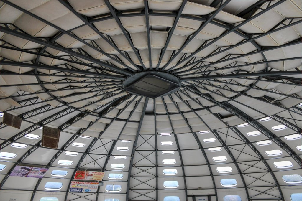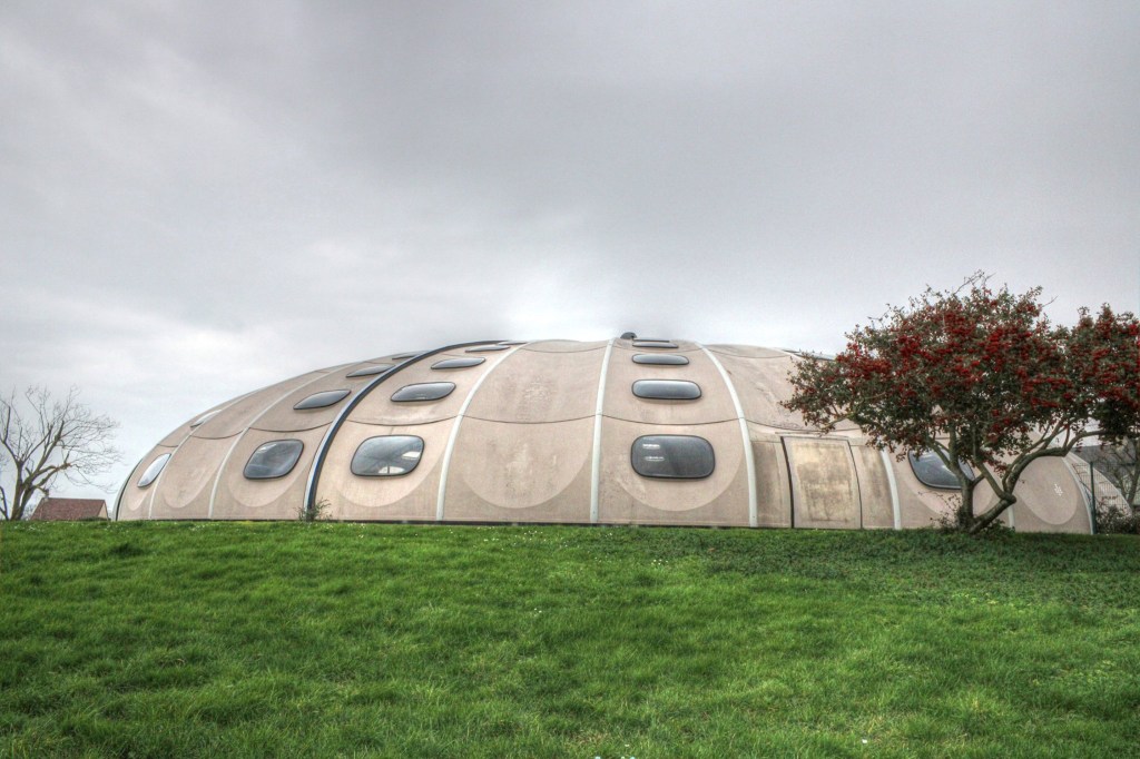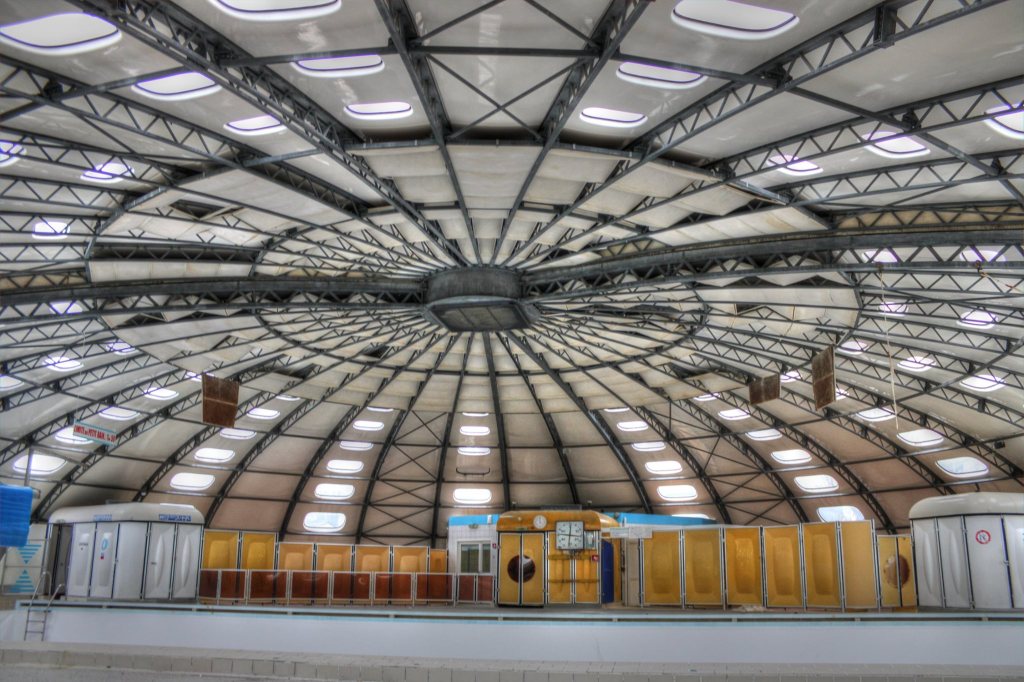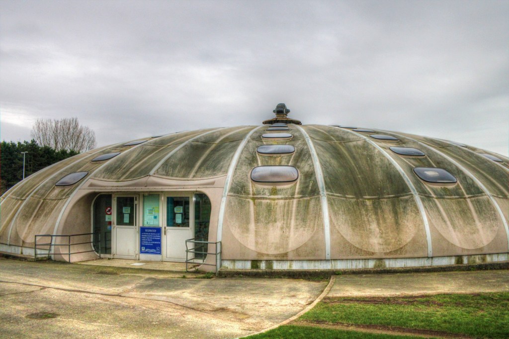 Sous forme de soucoupe volante de 6m de haut, possédant 36 arcs, l’été elle peut s’ouvrir jusqu’à 120° et son bassin à une profondeur maximale de 2,10 mètres